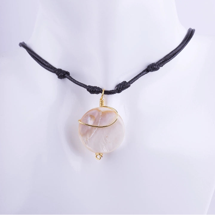 Captura la magia del océano. El Choker "Esencia de Mar" presenta un dije de nácar natural (Madre Perla) con iridiscencia única, envuelto a mano con delicado alambre dorado. Montado en un cordón de macramé ajustable, es la pieza perfecta para un look bohemio, playero o para añadir un toque orgánico y artesanal a tu estilo diario. Lleva la calma del mar siempre contigo.