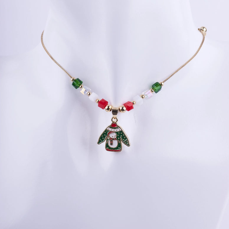 ¡Prepárate para la temporada más alegre del año con nuestro Collar Ugly Cute! Inspirado en el icónico y divertido "Christmas Sweater Feo", este collar es el accesorio perfecto para tus celebraciones navideñas. Presenta un adorable dije esmaltado de suéter con un muñeco de nieve, flanqueado por cuentas cúbicas de cristal en los colores clásicos de la Navidad: rojo, verde y blanco. Es el detalle ideal para llevar a la oficina, a tu fiesta de suéter feo o para regalar a ese espíritu festivo que tanto quieres. Un toque de alegría y humor en tu escote.