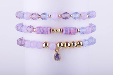Sumérgete en un mundo de colores suaves y vibrantes con este set de pulseras que es pura fantasía. La combinación de tonos lila, lavanda y azul pastel es una de las mayores tendencias de la moda actual, ofreciendo un accesorio que es dulce, moderno y sorprendentemente sofisticado. Ideal para inyectar un toque de color y alegría a tu look.